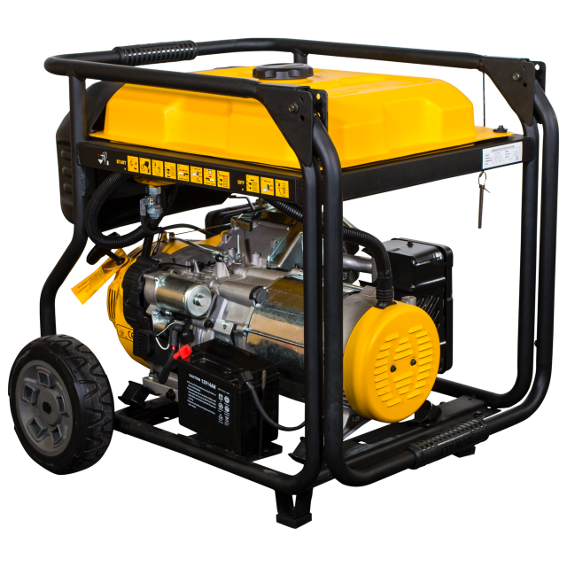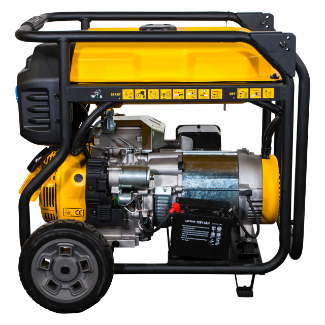 Het apparaat heeft een elektrische starter, wat de inbedrijfstelling eenvoudig en handig maakt. De robuuste behuizing beschermt het apparaat tegen invloeden van buitenaf en is ideaal voor gebruik in ruwe omgevingen. De geïntegreerde wielen en handgreep maken het transport gemakkelijk en ongecompliceerd.