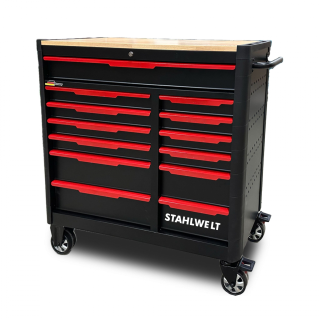 Deze Stahlwelt gereedschapswagen beschikt over 14 kogelgelagerde laden waarvan 11 gevulde laden met 755 delig gereedschap. Het gereedschap zit opgeborgen in stevige schuimrubberen modules waardoor deze optimaal beschermd zijn.