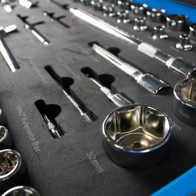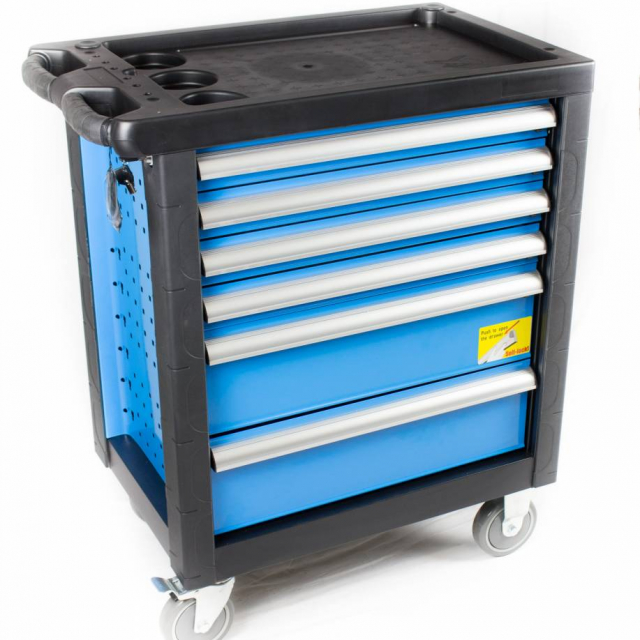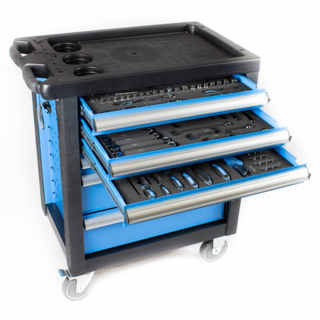 Deze gereedschapswagen is voorzien van een stevige stuurgreep en robuuste wielen. De inlays van deze wagen zijn vervaardigd uit hoogwaardig foam (schuimrubber). De wagen wordt geleverd inclusief 4 laden gereedschap met o.a. een doppenset,tangenset en compleet sleutelset.