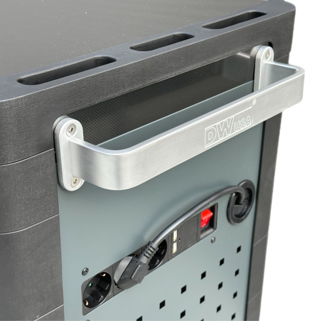 Für zusätzlichen Komfort und Vielseitigkeit ist der DWusa DW14 mit drei integrierten Steckdosen und sechs USB-Anschlüssen ausgestattet. Diese Funktionalität ermöglicht die Nutzung von Elektrowerkzeugen, Ladegeräten und anderen Geräten direkt vom Fahrzeug aus und trägt so zu einem organisierten und gut ausgestatteten Arbeitsplatz bei.