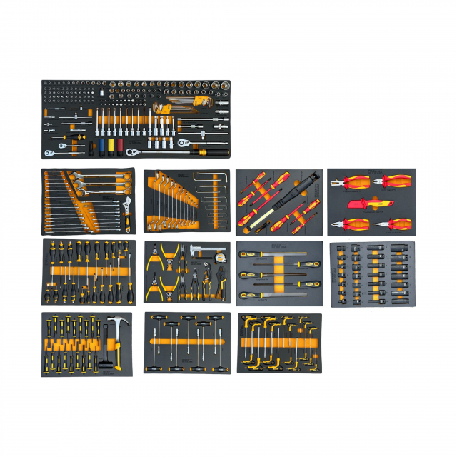 Mit 14 großzügigen Schubladen bietet der DW14 mehr als genug Platz, um alle Ihre Werkzeuge aufzubewahren. Von diesen Schubladen sind 12 vollständig mit einem beeindruckenden Satz von 755 hochwertigen Handwerkzeugen bestückt. Diese Werkzeuge sind sorgfältig in Schaumstoffmodulen organisiert, sodass sie immer griffbereit und gut geschützt sind. Dank des 100 % ausziehbaren Schnellverschlusssystems lassen sich die Schubladen leicht öffnen und verriegeln und sorgen so für ein sicheres und effizientes Arbeitserlebnis.