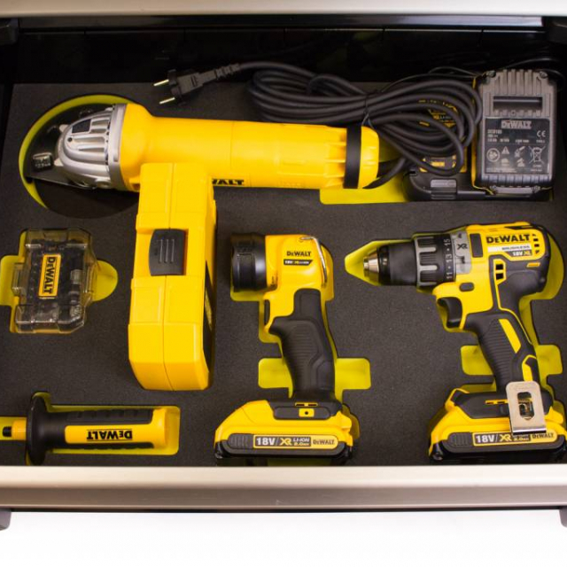 Deze zeer rijk uitgeruste Facom gereedschapswagen is voorzien van acht kogelgelagerde laden waarvan vijf laden bomvol met Facom gereedschap. Omdat deze gereedschapwagen een "limited edition" is krijgt u er nog wat extra opties bij waaronder: speciale limited edition kleurstelling,lederen stuurgreep,Facom logo in de lades,Facom logo uitgewerkt in roestvrijstaal op de onderste lade en een complete lade gevuld met DeWalt gereedschap! Facom is deze unieke samenwerking aangegaan met DeWalt en heeft een speciale module ontwikkeld met daarin: Dewalt 18v boormachine met 3 Li-on accu's, Led lamp, 125mm slijptol en een compleet DeWalt bitset.